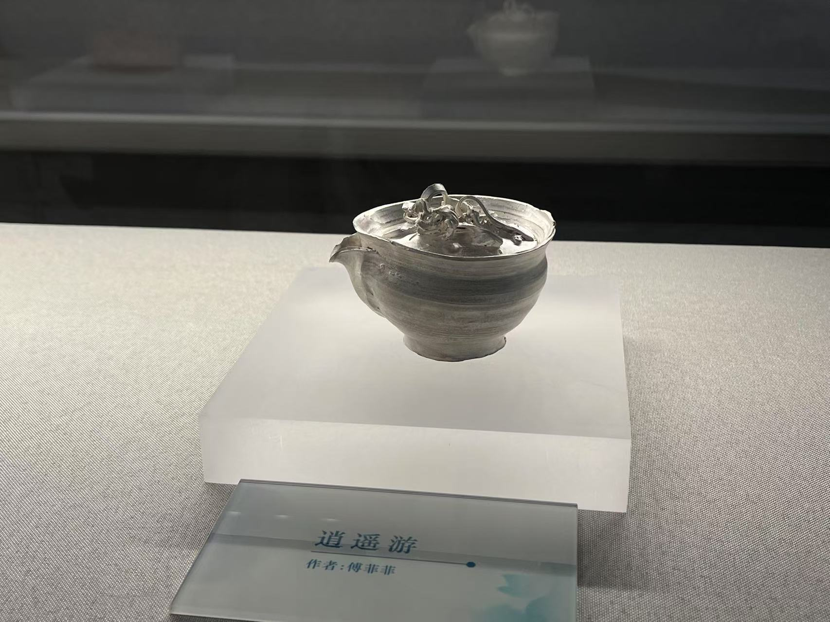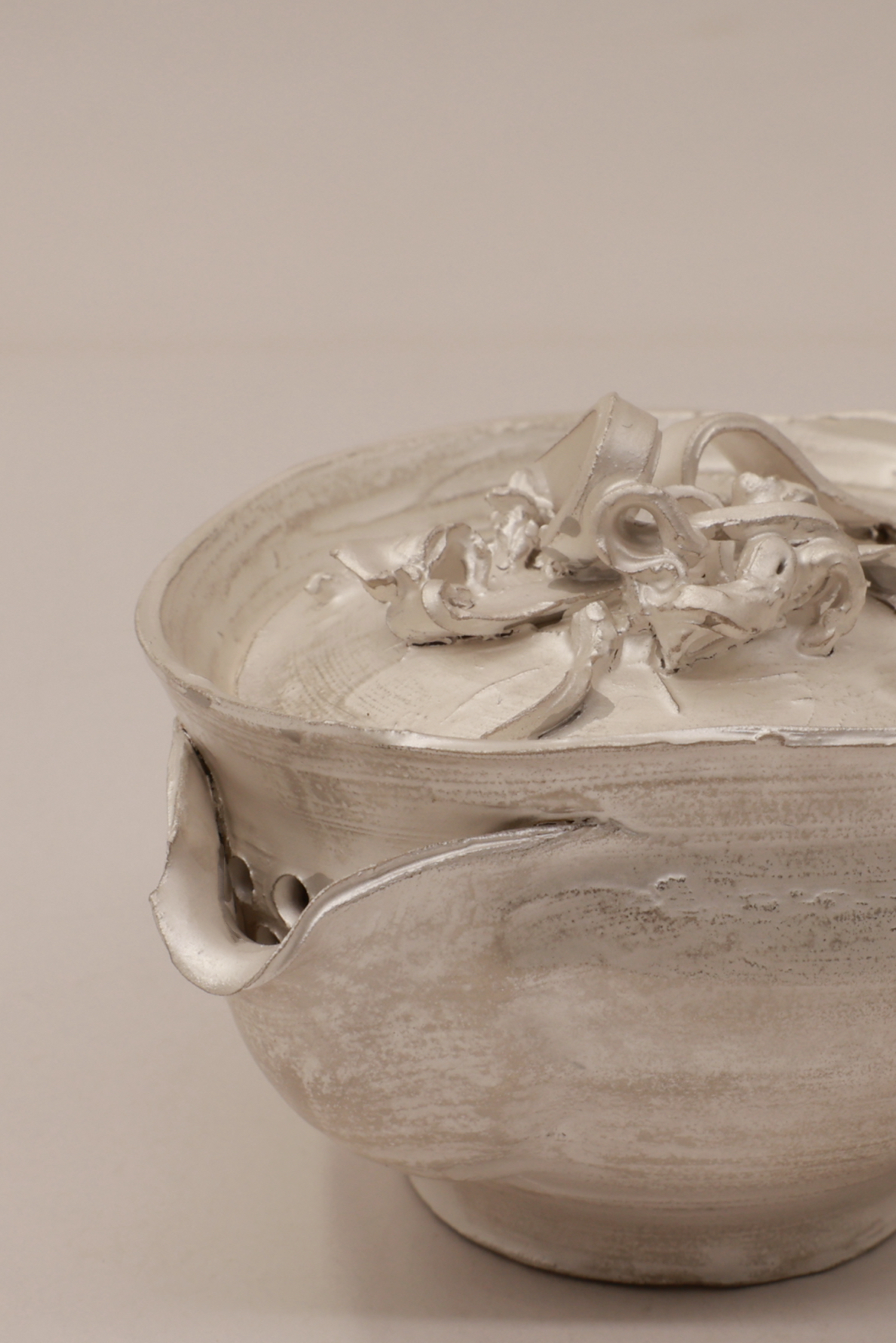 创作理念:黏土真的很神奇,因有水的加持,柔软似丝绸划过指尖,因有火的加持,又回归岩石般质地。创作者只有谦卑地顺应泥性,才能通过土的语言来表达。本次宝瓶的创作手法纯粹,只拉坯不修坯,尽可能保留创作痕迹而一气呵成。捉手是拉坯过程中的边角料率意堆砌,瓶身椭圆壶口向内边稍倾,看似随意的手法又尽量满足实用需求,盈盈一握,出汤利索,烤银后的金属质感又增添了一份现代气息,与写意的创作手法相得益彰,是创作者内心的一次浪漫之旅。