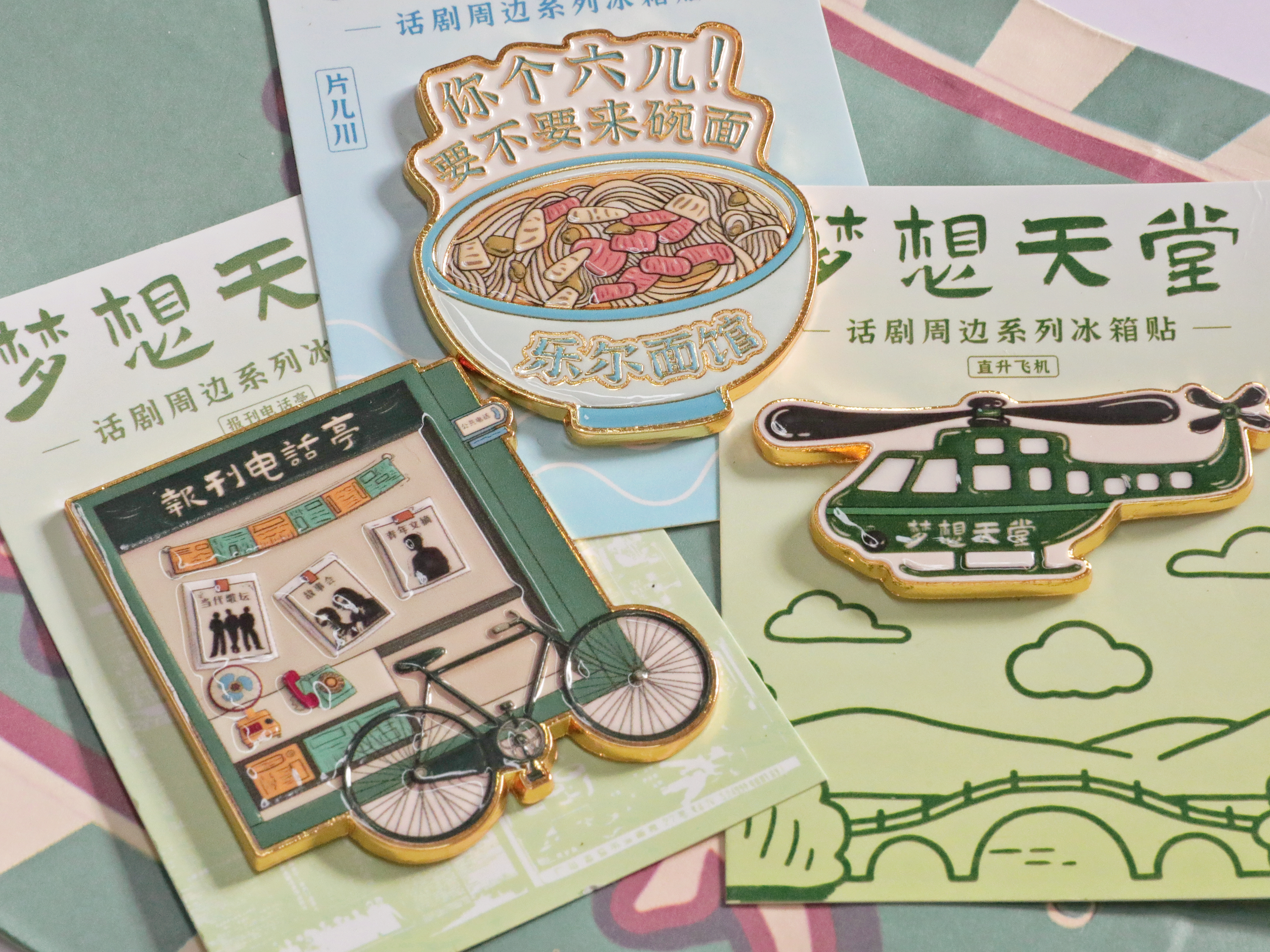 以剧中三个核心意象:乐尔面馆、报刊电话亭、直升飞机为灵感,通过浮雕冰箱贴工艺定格城市变迁与人物命运,三款拼合暗喻“从烟火到天堂”的剧情升华。让观众将“天堂”片段带回家中,在日常中重温剧中温暖与梦想。