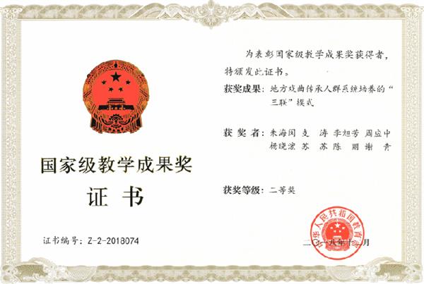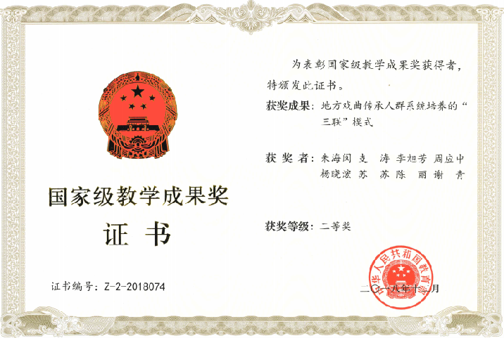 2014年,《校团合作培养戏曲演员的“现代学徒制”探索与实践》获国家级教学成果二等奖。