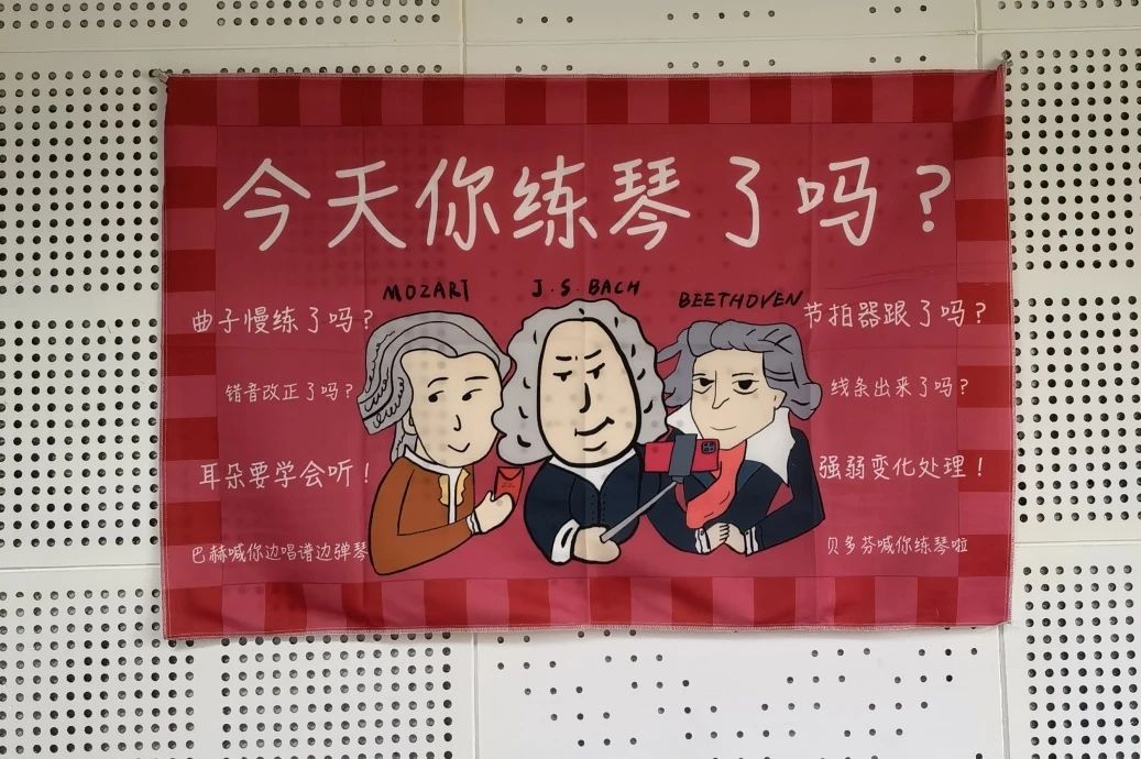 而现在在我的琴房墙上,也悬挂着一幅“三剑客”图——巴赫、莫扎特与贝多芬。在他们上方,赫然写着一句话:“今天你练琴了吗?”他们深邃的眼神仿佛在告诉我们:音乐之路需要持之以恒的努力和不懈的追求。这幅横幅是我与同事们分享交流教学经验与练琴感悟时,田甜老师向我支招并慷慨赠予我的。每当学生们走进琴房,看到这幅横幅和这三位伟大的音乐家,都会不自觉地感受到激励与鼓舞。