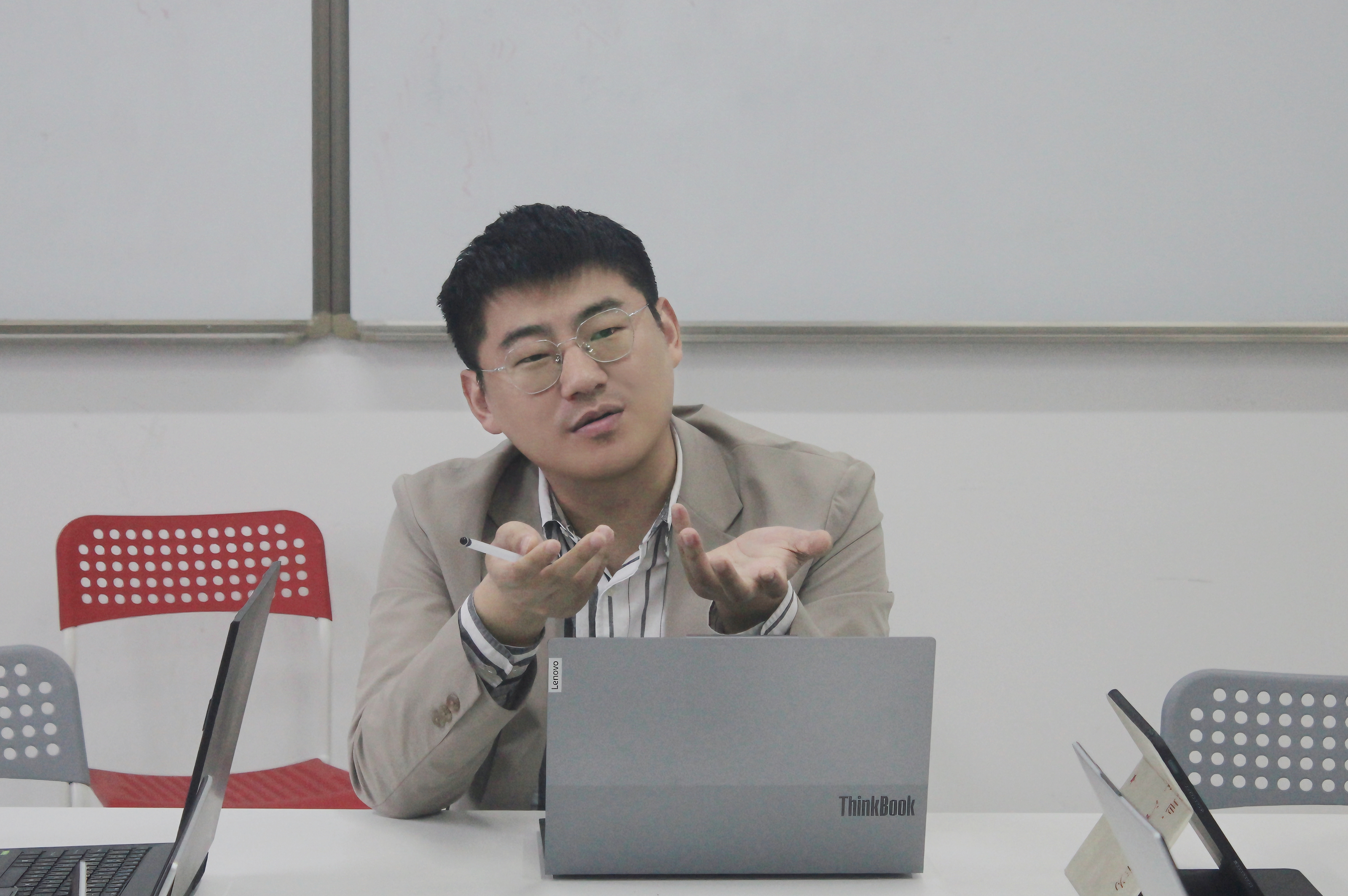 “陈老师才华横溢,上的课也非常有意思。”这些都是学生对陈思吉的感受。陈思吉的教学风格独具特色。他的课堂总是充满活力和创意,以学生为中心。他善于用生动有趣的案例和故事,将复杂的理论知识变得通俗易懂。用自己的故事和经历引导学生讲述自己的故事、大胆表达自己的观点,从不轻易否定任何一个人的想法。同时也会给学生推荐书籍和电影,通过阅读来积累丰富的人生经验。对于如何与学生相处,陈思吉也有一套属于自己的方式,他认为:“情绪共振是很重要的,但是也必须保留界限感。师生之间是一段缘分,要互相尊重,彼此珍惜。”这也是陈思吉与学生保持良好关系的原因。剧本课上,学生真情流露的瞬间,敢于分享自己人生经验的勇气都令他难忘。他关心学生,会耐心倾听学生的烦恼和困惑,并给予学生真诚的建议和帮助。他尊重学生的个性和选择,鼓励他们勇敢追求自己的梦想。他用自己的亲和力和人格魅力,赢得了每一名学生的喜爱和尊重。